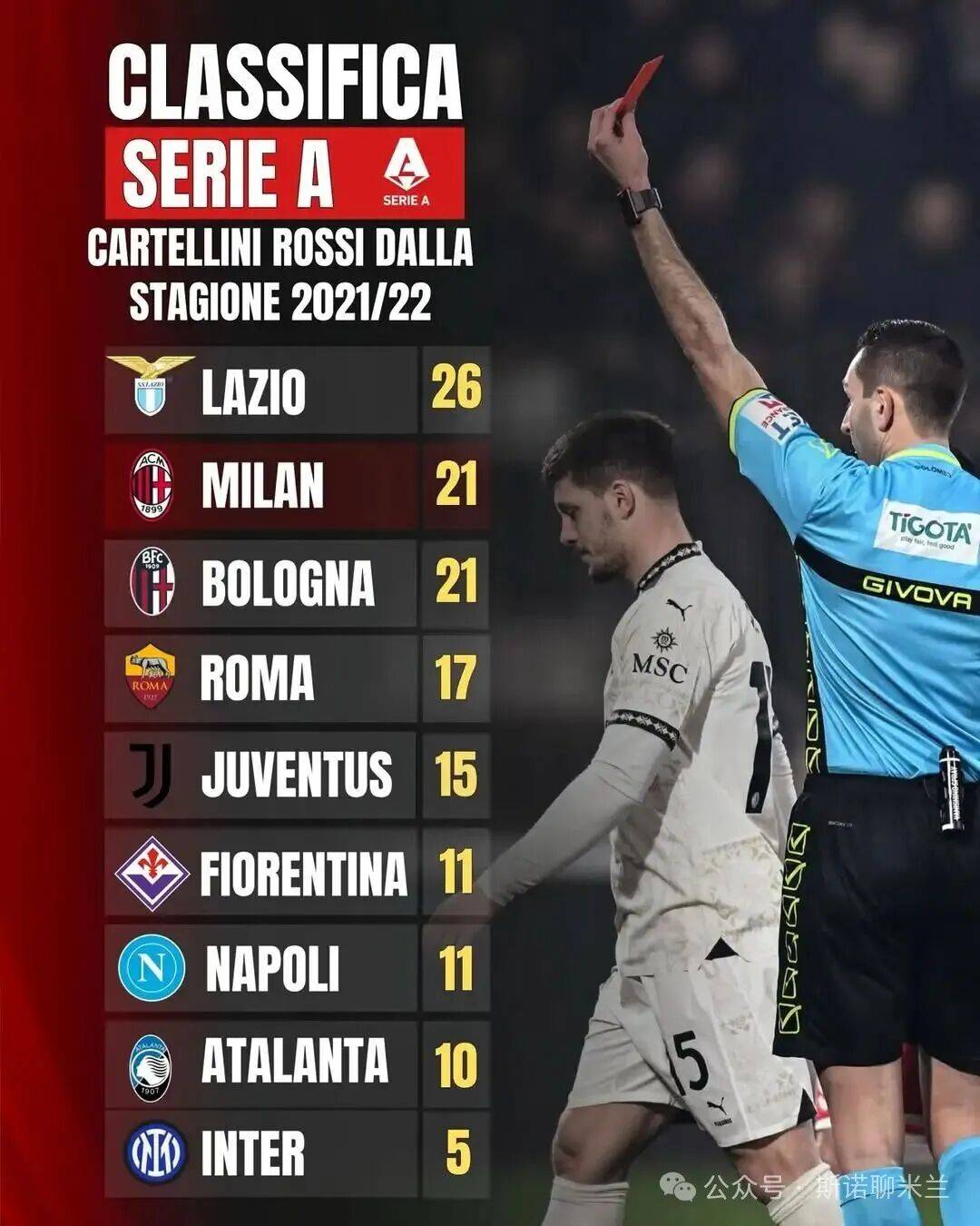 意甲近五个赛季红牌榜,米兰为国米四倍